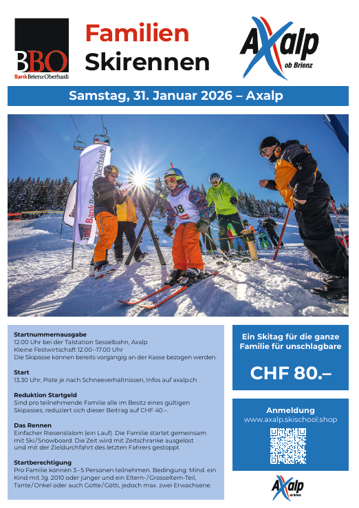 Das BBO-Familienskirennen ist für die ganze Familien ein tolles Erlebnis. Starten Sie mit Ihrer Familie in 3er bis 5er Teams bei einem einfachen Riesenslalom. Die Zeitnahme erfolgt, wenn das letzte Mitglied über die Ziellinie gefahren ist. Für die Verpflegung steht eine Festwirtschaft bei der Talstation Sesselbahn zur Verfügung. Verbringen Sie einen gemütlichen Schneesporttag mit Ihrer Familie auf der Axalp - oberhalb des Brienzersees.